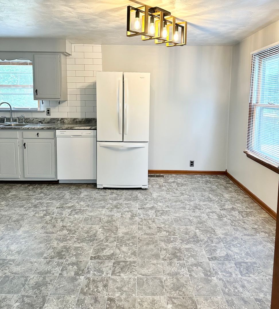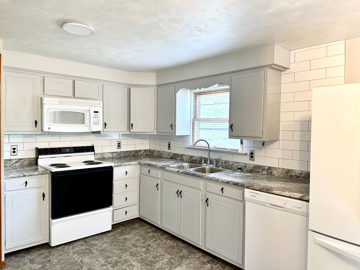 Step inside to a generous living room with gorgeous hardwood floors, which also extend into both upstairs bedrooms. The large eat-in kitchen boasts bright white cabinetry and plenty of storage, and comes fully equipped with a stove/oven, microwave, refrigerator, and dishwasher.